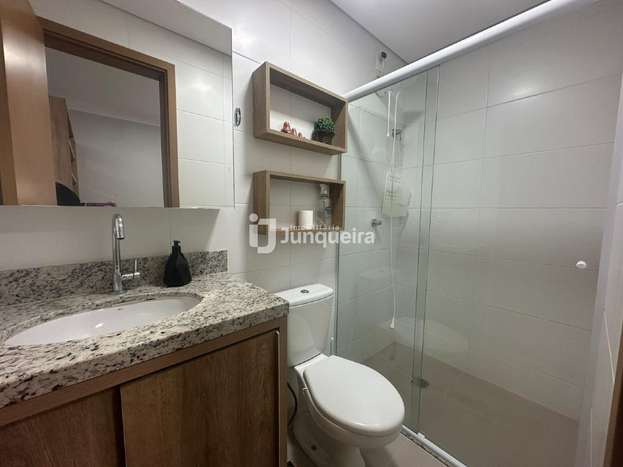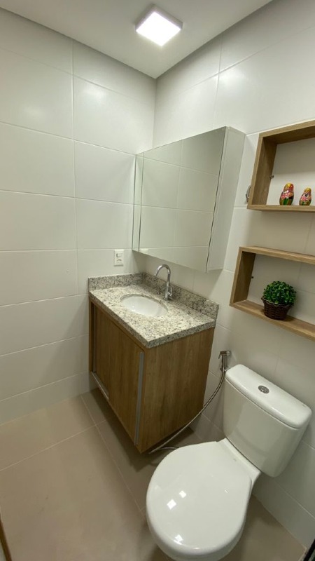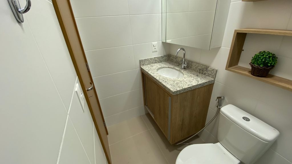 - 1 banheiro social com gabinete, espelho e box