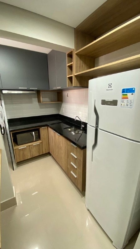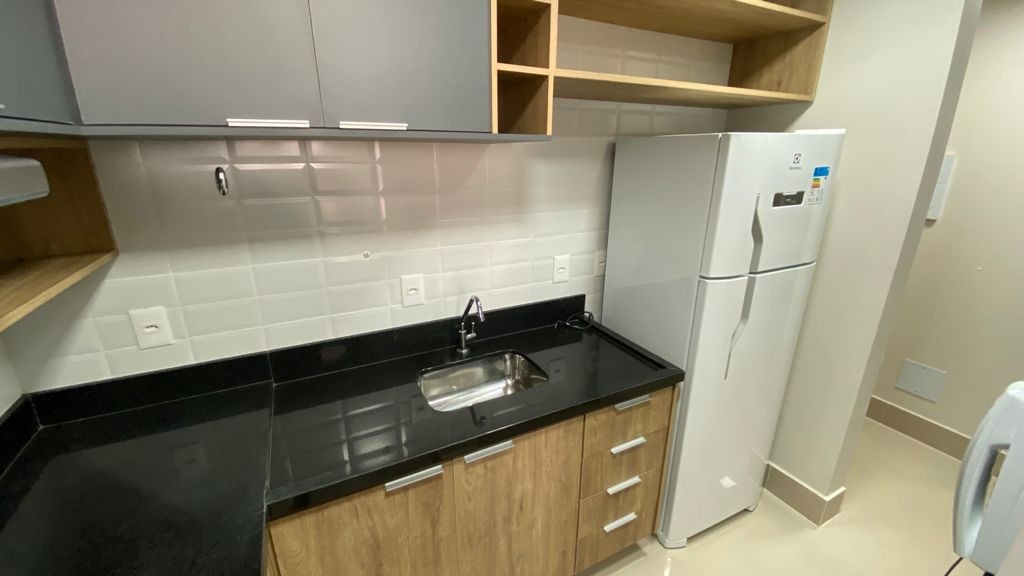 - Cozinha planejada equipada com geladeira, fogão e micro-ondas