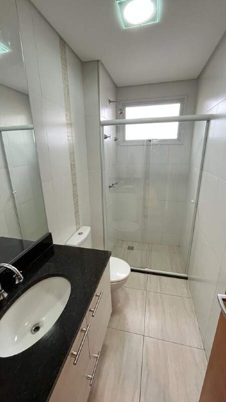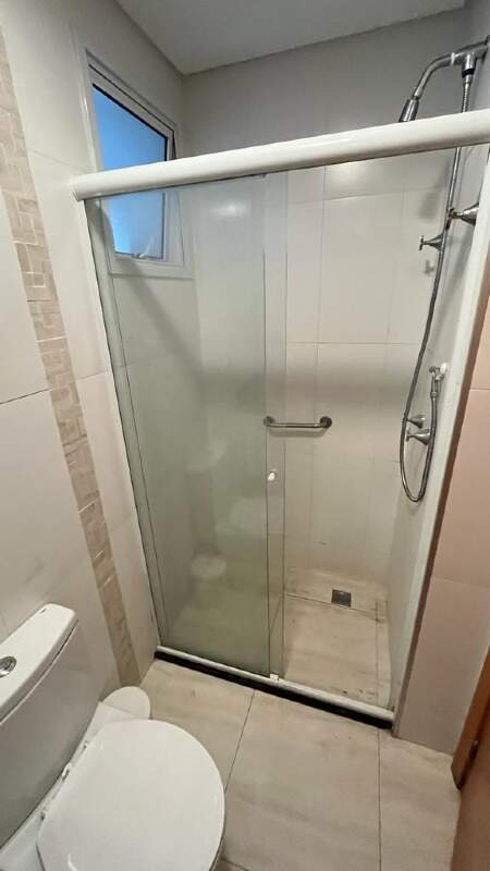 - Banheiro social com pia, gabinete, espelho, box blindex e chuveiro