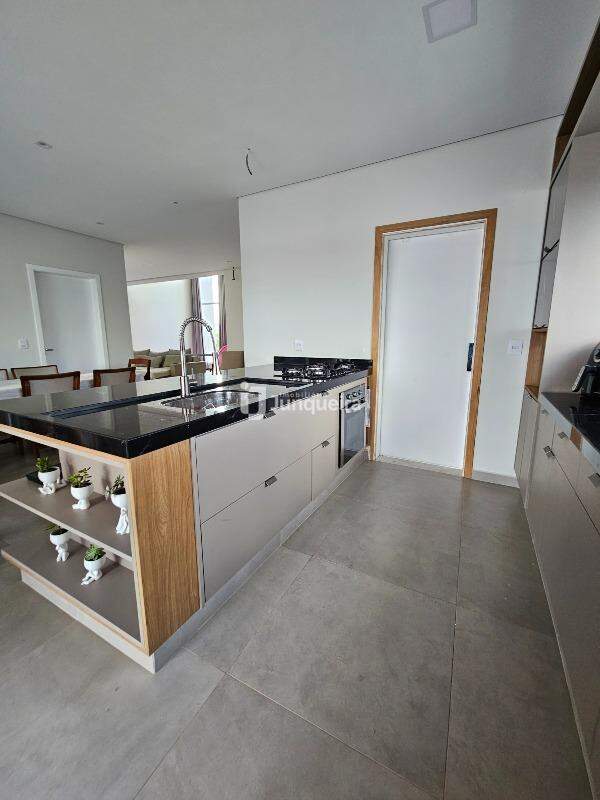 - Cozinha em ilha planejada equipada com cooktop, forno elétrico, lava-louças, geladeira e micro-ondas